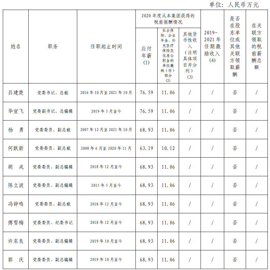 上表披露薪酬为我集团负责人报告期内全部应发税前薪酬(不含发放的以往年度绩效年薪)。其中,第1项和第4项由省委宣传部和省财政厅核定。